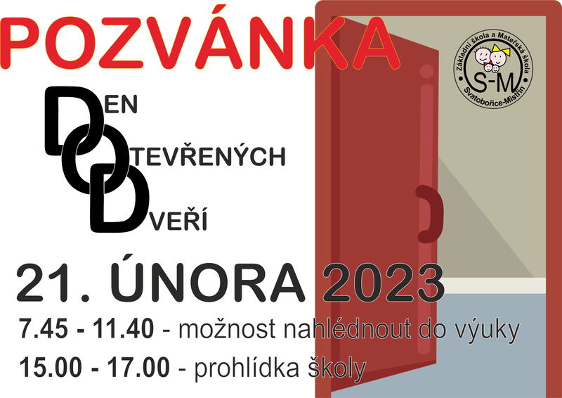Základní škola a Mateřská škola Svatobořice-Mistřín, okres Hodonín, příspěvková organizace si Vás dovoluje pozvat na Den otevřených dveří, který proběhne dne 21. února 2023 v prostorách základní školy